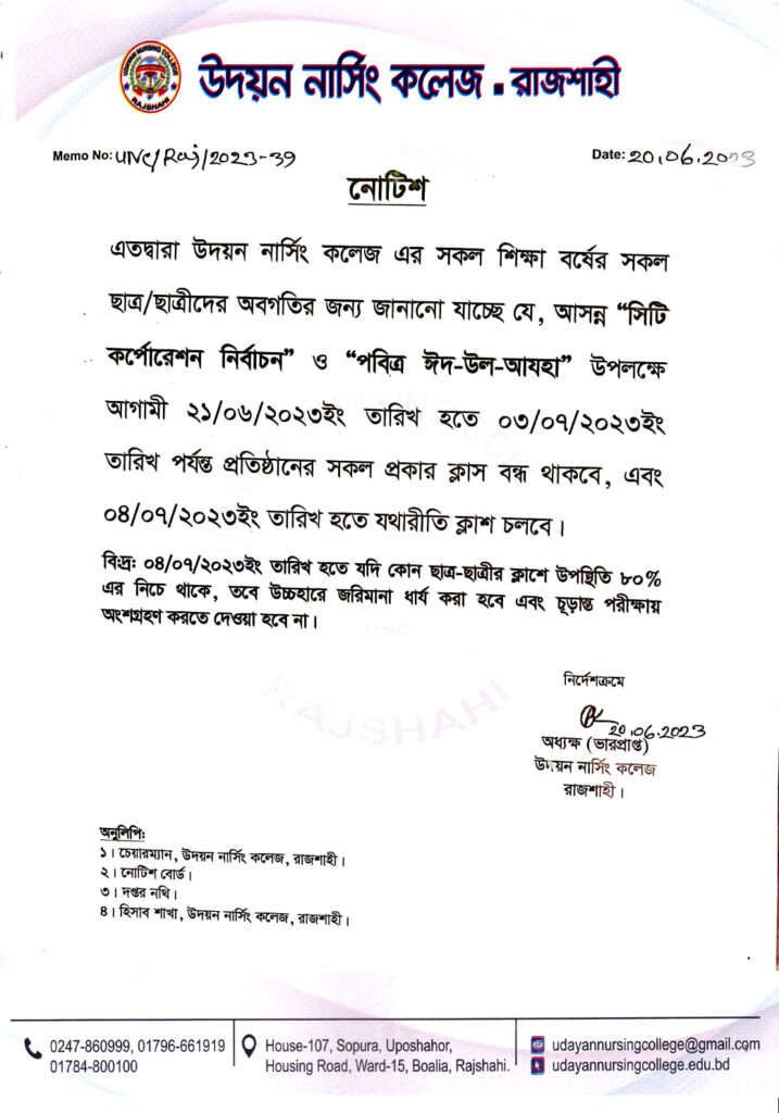 সিটি কর্পোরেশন নির্বাচন ও পবিত্র ঈদ-উল-আযহা উপলক্ষে ক্লাস বন্ধ সংক্রান্ত ছুটির নোটিশ